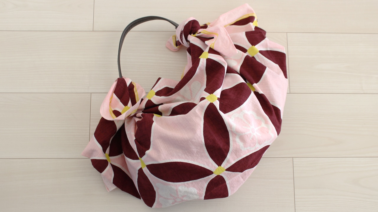 風呂敷を金具に通して縛るだけ。四角い生地ならバンダナやスカーフもOK。ご自分のお好きな生地を好きなサイズを正方形に仕立てた生地をお使いになっても楽しい!